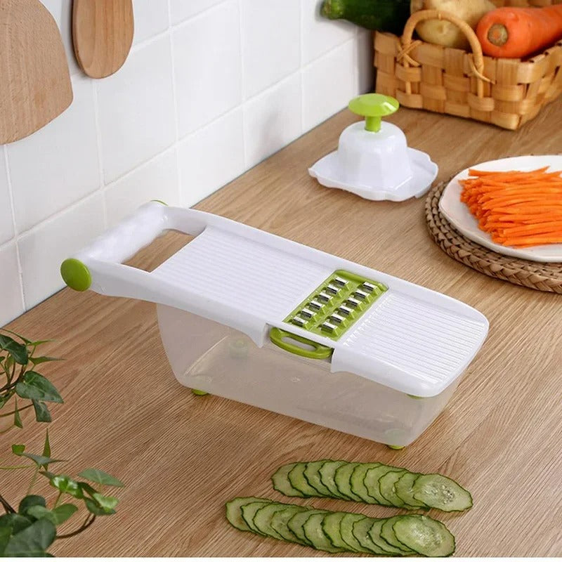 Avec notre mandoline cuisine : préparation rapide et facile de vos plats Découvrez notre mandoline cuisine polyvalente, l'outil indispensable pour révolutionner votre expérience culinaire. Cette trancheuse à main innovante offre une solution tout-en-un pour trancher, râper et couper avec une précision inégalée. Avec ses 8 lames interchangeables, elle s'adapte à tous vos besoins de préparation, transformant les légumes, fromages et fruits en un tour de main. Réduisez votre temps de préparation avec notre mandoline cuisine Imaginez pouvoir préparer tous vos ingrédients en un temps record. Avec notre mandoline cuisine, c'est désormais possible. Sa conception ergonomique et ses lames ultra-tranchantes vous permettent de couper, trancher et râper rapidement et sans effort. Dites adieu aux longues heures de préparation et profitez de plus de temps pour savourer vos créations culinaires. Sécurité et praticité : notre mandoline cuisine a été pensée pour vous La sécurité est au cœur de la conception de notre mandoline cuisine. Les lames intégrées sont conçues pour protéger vos mains des coupures accidentelles, vous permettant de cuisiner en toute tranquillité. De plus, le récipient intégré récupère proprement tous vos ingrédients préparés, facilitant le contrôle des quantités et assurant une cuisine propre et organisée. Avec notre mandoline cuisine, optez pour des résultats professionnels Fabriquée avec des matériaux de haute qualité, notre mandoline cuisine est conçue pour durer. Les lames en acier inoxydable maintiennent leur tranchant même après une utilisation intensive, garantissant des coupes nettes et précises à chaque utilisation. Le corps robuste de l'appareil assure stabilité et durabilité, vous permettant de profiter de votre mandoline pendant des années. Une solution économique et écologique En investissant dans notre mandoline cuisine, vous éliminez le besoin de plusieurs appareils encombrants. Non seulement cela vous fait économiser de l'argent à long terme, mais cela contribue également à réduire l'encombrement dans votre cuisine et votre impact environnemental. C'est un choix intelligent pour une cuisine moderne et responsable. Caractéristiques