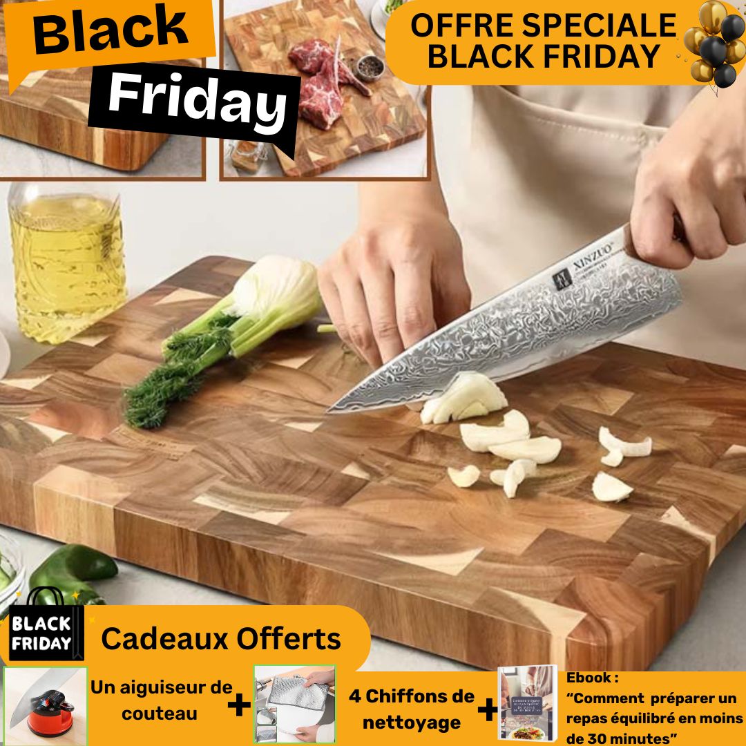 Contrairement aux planches conventionnelles qui s'usent prématurément, notre planche à découper en bois d'acacia résiste remarquablement à l'épreuve du temps. Ce bois noble possède des propriétés naturelles anti-bactériennes et une densité parfaite qui préserve vos couteaux tout en garantissant une surface de travail impeccable année après année.