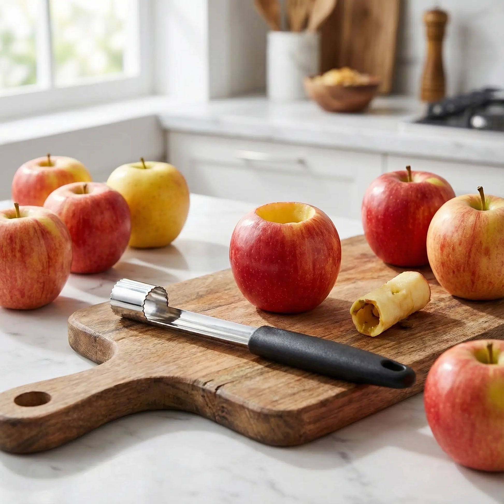 La magie opère véritablement quand vous voyez la différence entre avant et après. Les pommes évidées uniformément donnent un aspect professionnel à vos créations culinaires.
